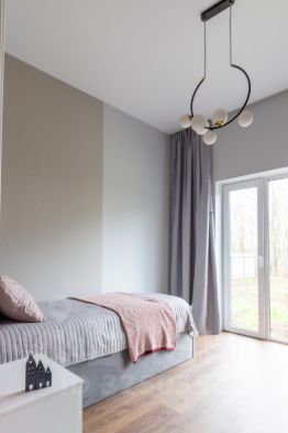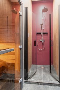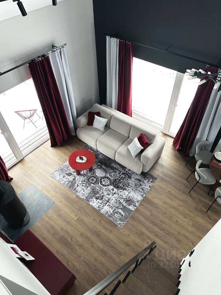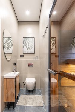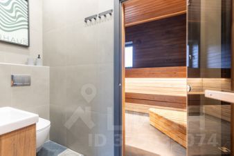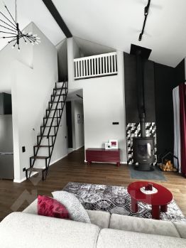 Кухня со всем необходимым, мастер-спальня со своим санузлом, 2 гостевые спальни, гостиная с камином, санузел с сауной, террасой и лаунж-зоной на втором этаже.