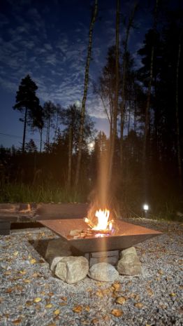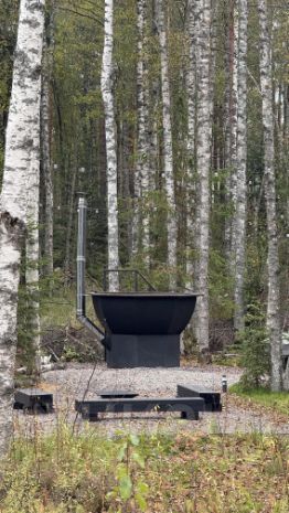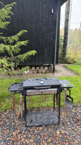 Есть мангал с крышкой и термометром, шампура и решетка тоже имеются. Дрова в вашем распоряжении(уголь и розжиг берите с собой)