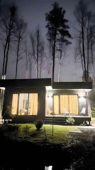 В каждой из комнат установлены панорамные окна из которых открывается вид на лес.