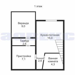 - Первый этаж 21 кв. м.: полностью оборудованная кухня-гостиная + совмещенный санузел с душевой кабиной + закрытая пристройка + терраса под навесом;