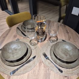 Кухня оснащена всей необходимой бытовой техникой и кухонными принадлежностями: вместительный холодильник, электрическая плита на 2 комфорки, микроволновая печь, духовой шкаф, посудомоечная машина, тостер, чайник, комплект посуды для готовки и сервировки, бокалы для вина.