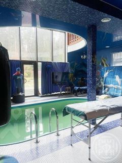 На первом этаже находится кухня-гостиная, сан.узел, душевая, зона отдыха с бассейном и тренажерами на все группы мышц. Панорамные окна, находясь в бассейне можно наблюдать прекрасные виды природы. Также в этой части дома есть массажный стол, по договоренности можно сделать профессиональный массаж.