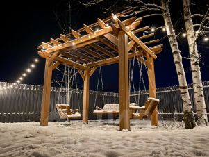Уютный участок: качель для отдыха, костровая зона и мангал для готовки на свежем воздухе.
