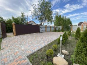 Огорожен высоким забором, ворота на пульте, площадка для парковки.