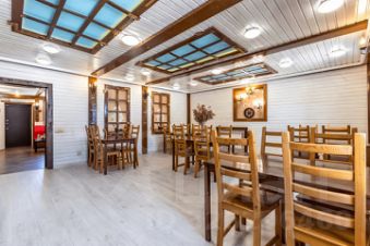 - Просторная кухня-гостиная с ТВ-зоной (вмещает до 30 гостей)