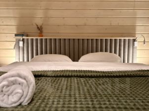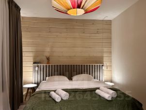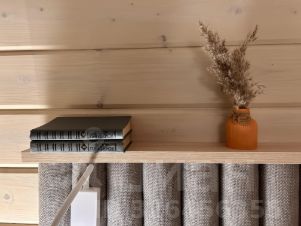 На первом этаже - просторная кухня-гостиная с камином, панорамные окна с видом на лес и выходом на террасу, сауна, постирочная, санузел с душевой кабиной, 2 спальни с гардеробной и шкафом.