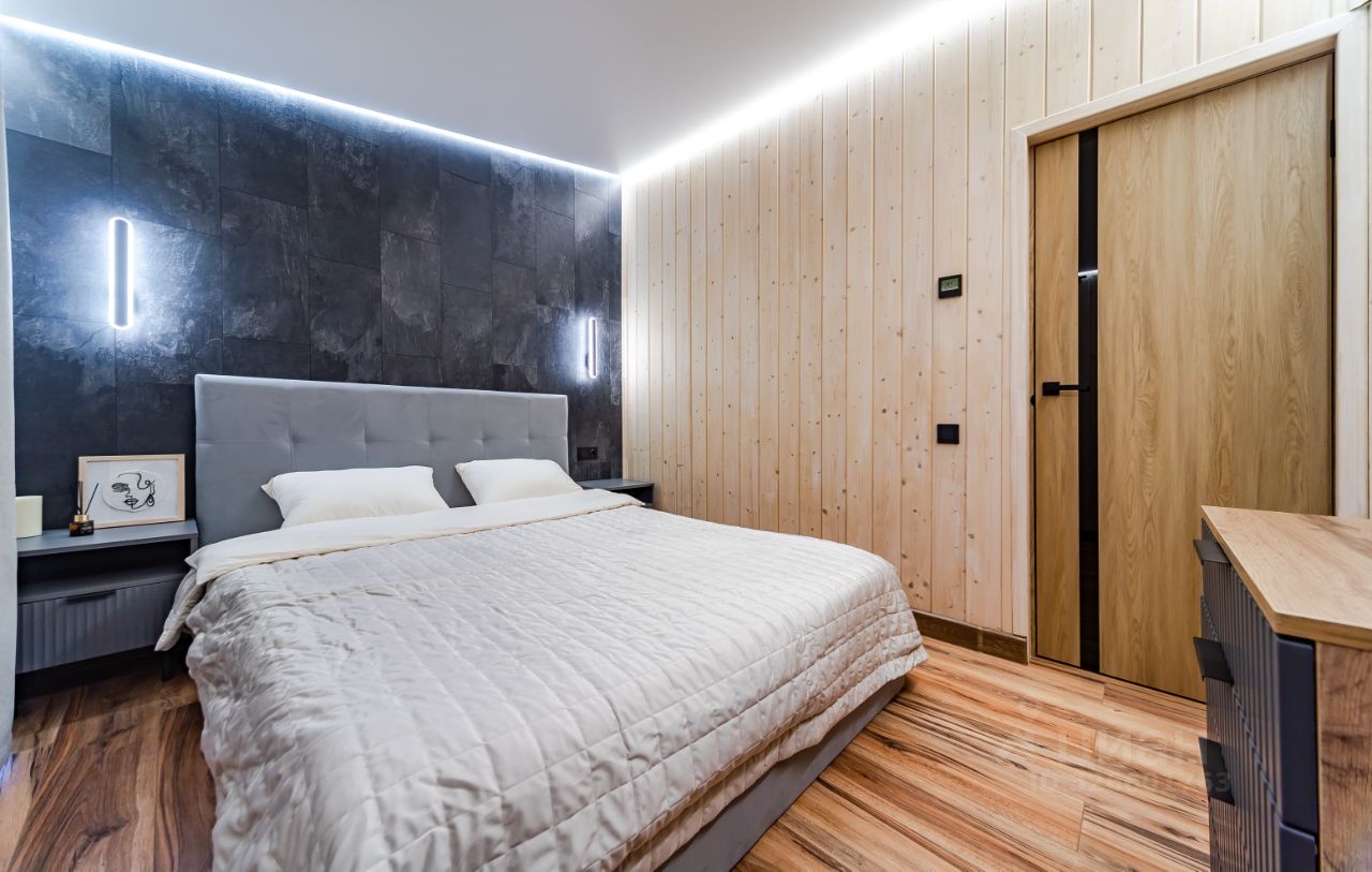 — спальня с двуспальной кроватью, прикроватными тумбочками и комодом;