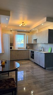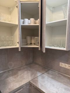 - современная кухня, оборудованная двухкамерным холодильником, варочной поверхностью, духовкой, микроволновой печью, чайником, посудой;