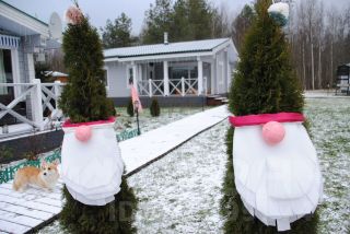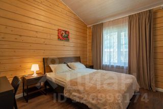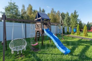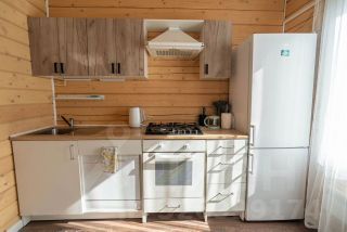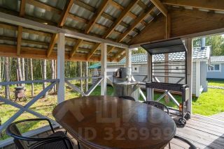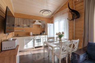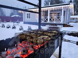 Домик Логово Бобра — премиум, с мангальной зоной в отдельной беседке. На огороженной территории расположены пять домиков, баня, чан, батут, детская площадка и курятник с поющим петухом.