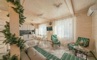 Коттедж предлагает полный набор удобств и комфорта, включая полностью оборудованную кухню, где вы сможете приготовить свои любимые блюда, а также просторные и уютные спальни. На втором этаже располагаются 4 спальни с двуспальными кроватями + кроватка для младенца. На первом этаже есть отдельная комната с раскладным диваном на одного человека. Максимальная вместимость дома 9 взрослых. Дети до трех лет - бесплатно.