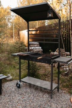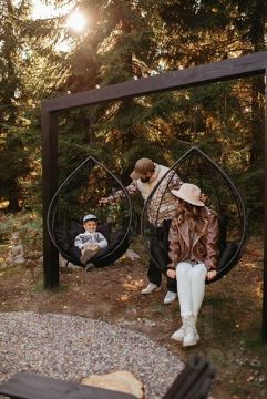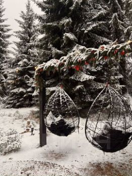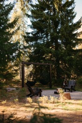 Очень красивое лобное место в окружении елок, с костровой чашей и качелями как из Pinterest.