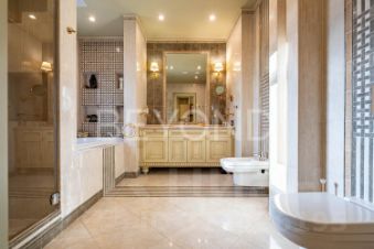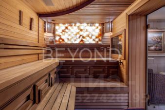 Дом включает четыре уровня с лифтом и объединяет две автономные функциональные половины. На цокольном уровне — SPA-зона с бассейном, сауной, хаммамом и холодильной комнатой для хранения меховых изделий.