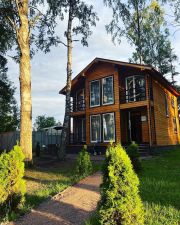 Сдаётся пocуточнo и на длительный срок новый уютный двухэтажный панорамный коттедж с камином на дровах и панорамным остеклением с видом на вековые сосны,на берегу голубого чистейшего озера с красивым большим пляжем и волейбольной площадкой в поселке Келколово-1