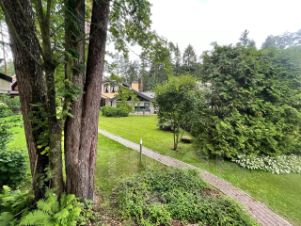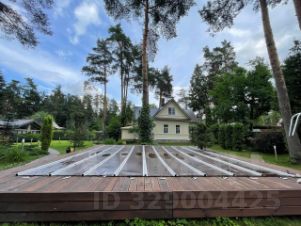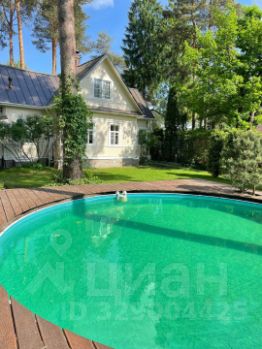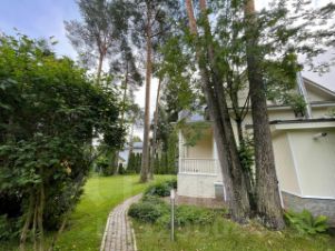 На участке сосны, лужайка, цветы, ландшафтный дизайн и большой круглый бассейн 6 метров в диаметре с подогревом и подиумом. Купаться можно до заморозков.