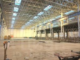 - Производственное здание размером 156х132 м состоит из пяти продольных пролетов шириной 36 м-2 шт, 24 м-1 шт и 18 м-2 шт. метров, высота цеха 23 м (полезная высота 19 м), установлено крановое оборудование г/п 72т. Полы беспыливые, с максимальной нагрузкой до 320 кПа (32тс/м2). По цеху разведена система отопления.