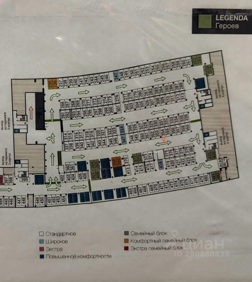 Продается машиноместо в паркинге по адресу пр. Героев 31, стр 1, ЖК Легенда Героев. Номер места 354, -2 этаж, находится под корпусом 4 (Аметист), рядом с лифтом.