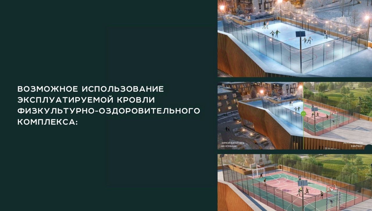 Площадь тех. помещений ФОКа - 1101.5 м2 / Площадь эксплуатируемой кровли - 1090,17 м2
