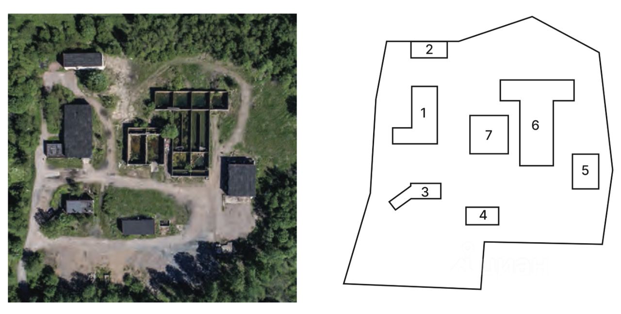 6 строений (3 здания и 3 сооружения), общей площадью 2222 кв. м