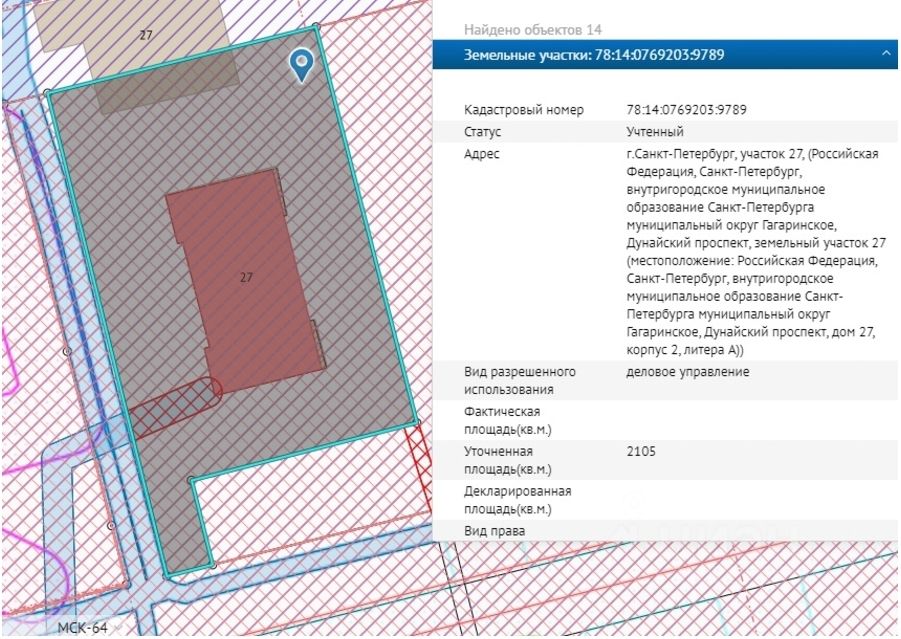 Земельный участок площадью 2105 кв.м, категория земель: земли населенных пунктов, вид разрешенного использования: деловое управление, кадастровый номер 78:14:0769203:9789, адрес: г.Санкт-Петербург, внутригородское муниципальное образование Санкт-Петербурга муниципальный округ Гагаринское, Дунайский проспект, земельный участок 27 СОБСТВЕННОСТЬ.