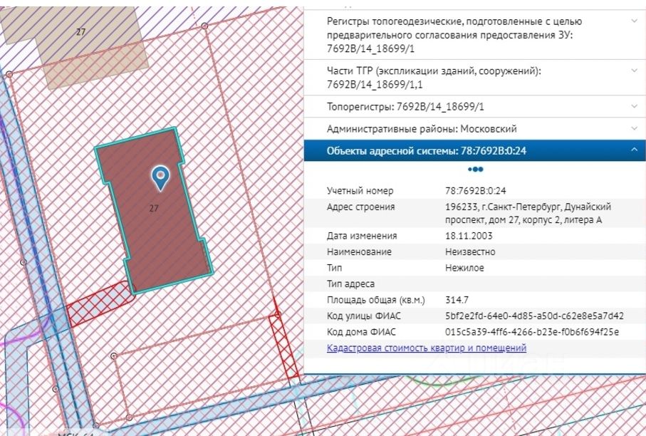 Здание, площадью 314,7 кв.м. (под снос или реконструкцию), этаж 1, назначение Деловое управление, кадастровый номер 78:14:0769203:3040, адрес: г.Санкт-Петербург, Дунайский проспект, дом 27, корпус 2, литера А СОБСТВЕННОСТЬ.
