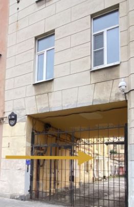 Вход в помещение осуществляется через большую арку с улицы Маяковского;