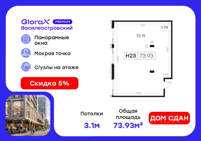 Продается офисное помещение свободного назначения - 73, 93 кв.м. в премиальном проекте GloraX Premium Василеостровский.