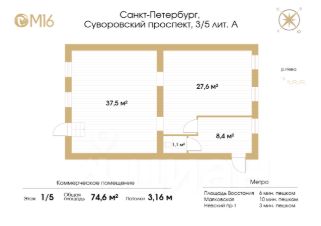 Предлагается к продаже помещение свободного назначения, расположенное по адресу: Санкт-Петербург, Суворовский проспект, 3/5, литера А. Объект расположен на первом этаже 5-этажного здания и имеет отличное местоположение в центральной части города.