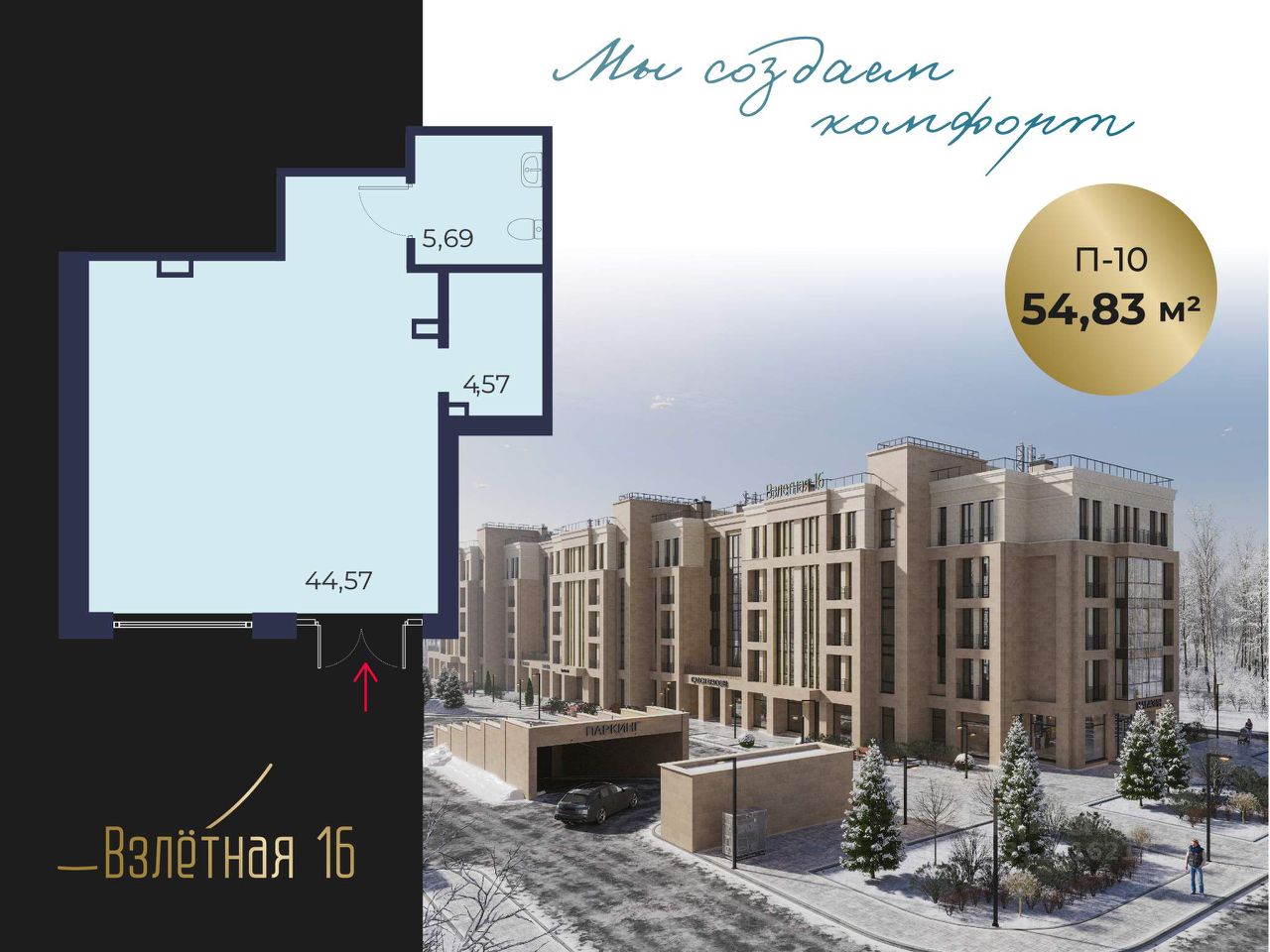 Продается от застройщика коммерческое помещение площадью 54.83 м2, в жилом комплексе бизнес-класса "Взлетная 16".