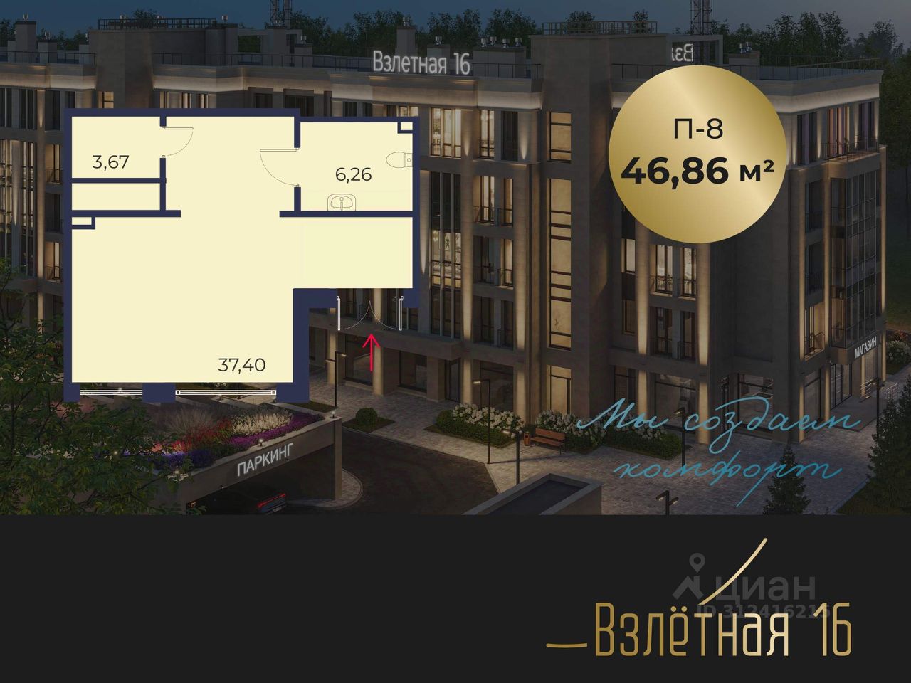 Продается от застройщика коммерческое помещение площадью 46.86 м2, в жилом комплексе бизнес-класса "Взлетная 16".