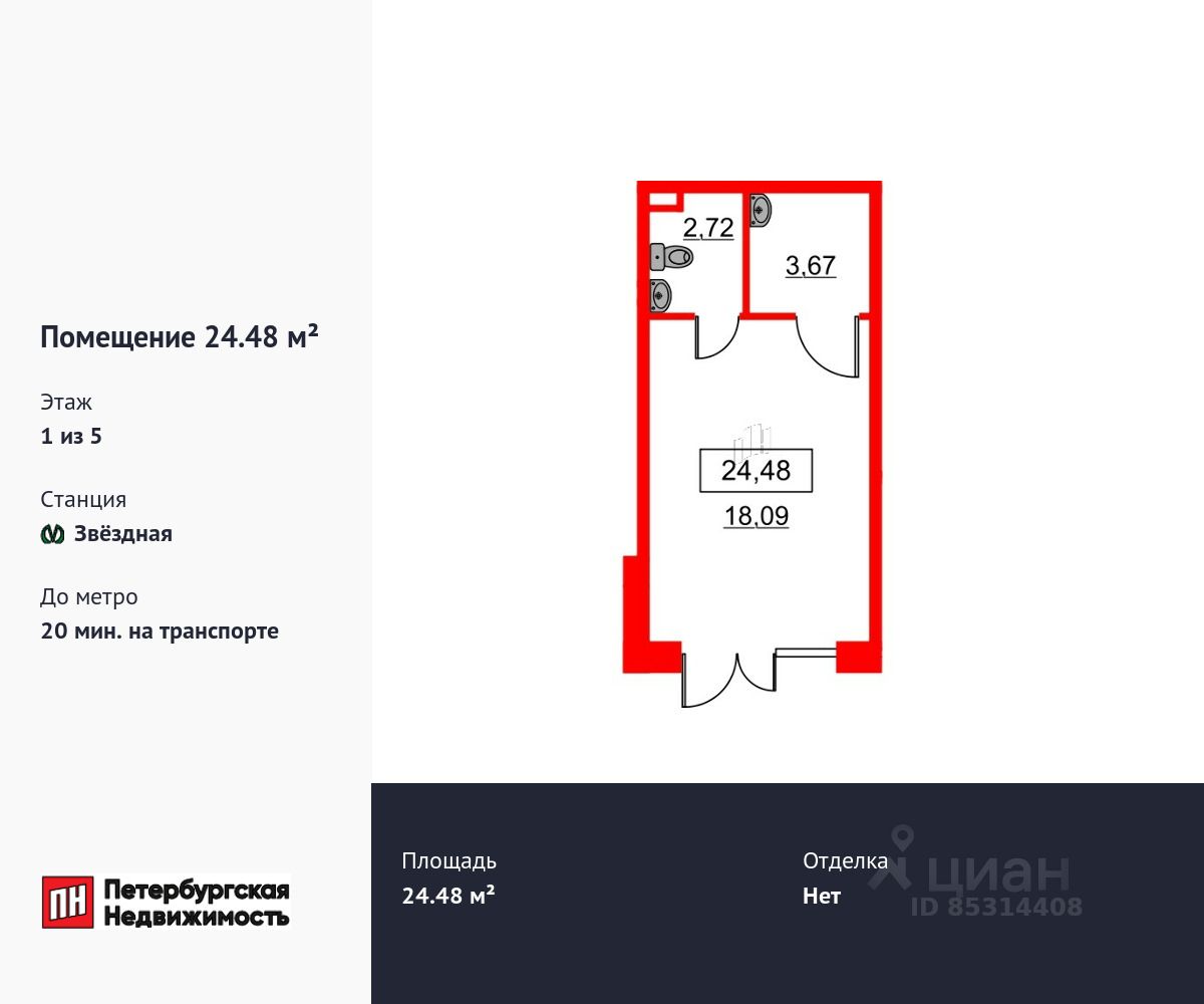 Продается помещение в ЖК Парадный ансамбль площадью 24.48 м2. Помещение расположено рядом с метро Московская. Расстояние до метро 20 Мин.на транспорте. Корпус сдается в 2025. Без отделки.