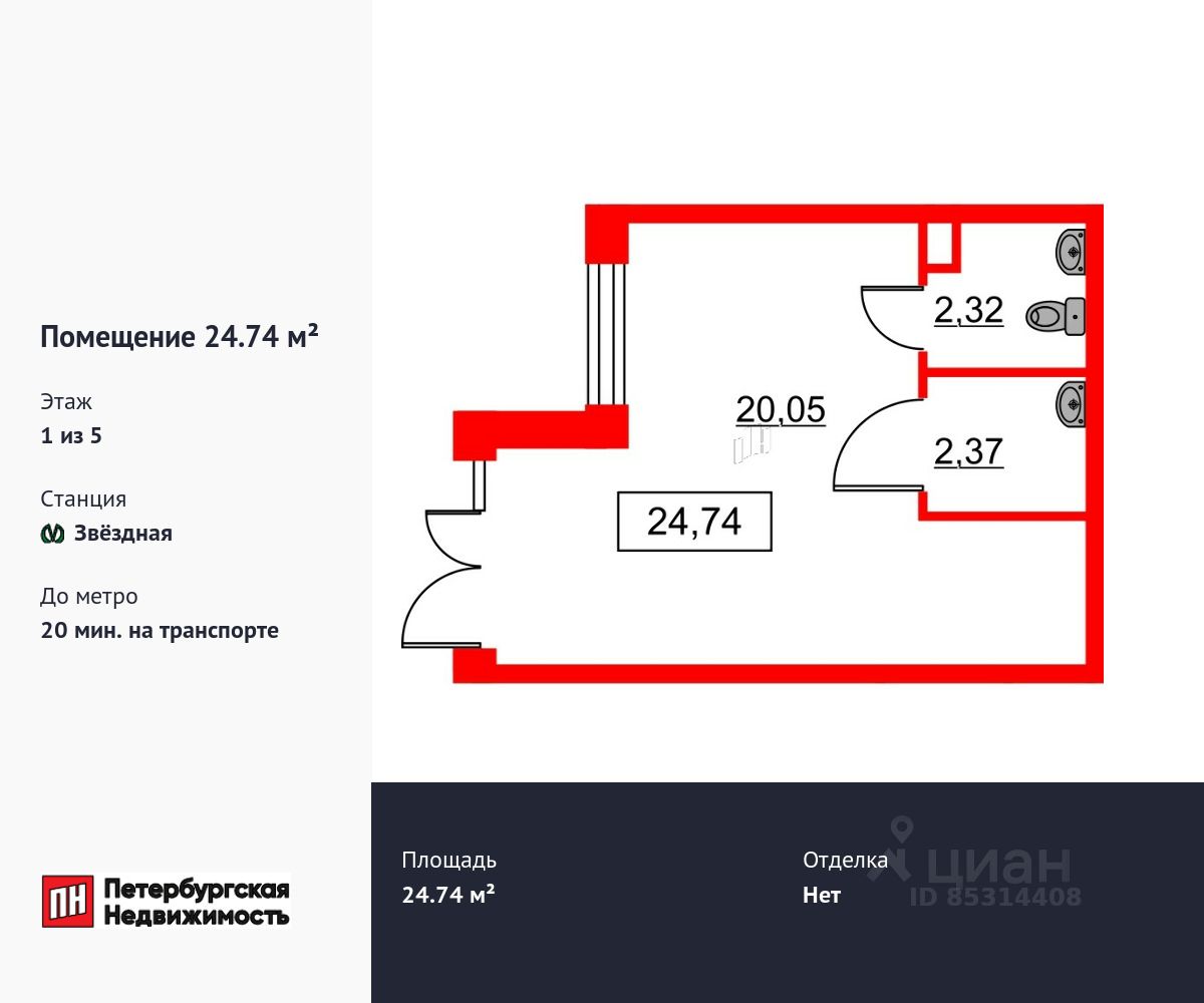 Продается помещение в ЖК Парадный ансамбль площадью 24.74 м2. Помещение расположено рядом с метро Московская. Расстояние до метро 20 Мин.на транспорте. Корпус сдается в 2025. Без отделки.