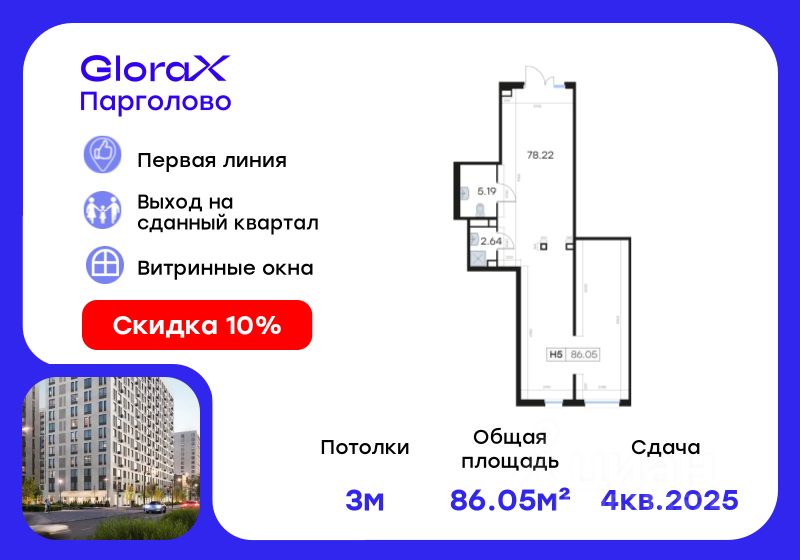 Продается помещение свободного назначения площадью 86,05 кв.м. в жилом комплексе комфорт-класса GloraX Парголово.