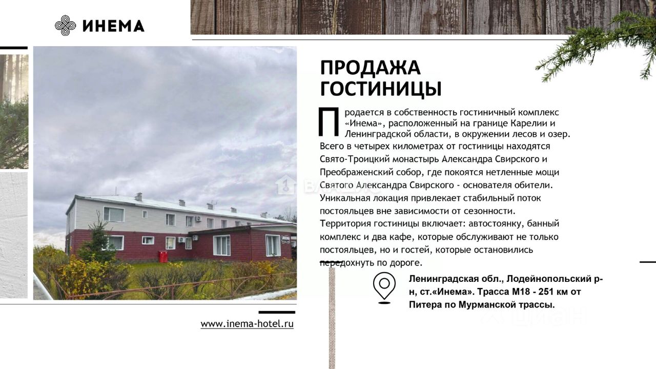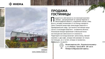 Ищете надёжное вложение средств? Хотите открыть свой бизнес в Ленинградской области? Тогда это предложение для вас! Продаётся высокорентабельный бизнес со сроком окупаемости 4 года, действующая гостиница, расположенная на федеральной трассе "Кола", Санкт-Петербург - Мурманск, в 5 км от железнодорожной станции Инема, в живописном Лодейнопольском районе, в 10 минутах от Александра-Свирского мужского монастыря и 20 минутах от города Лодейное Поле. В 150 метрах находится экологически чистое озеро "Утоозеро ". Готовый действующих бизнес, 26 лет на рынке.