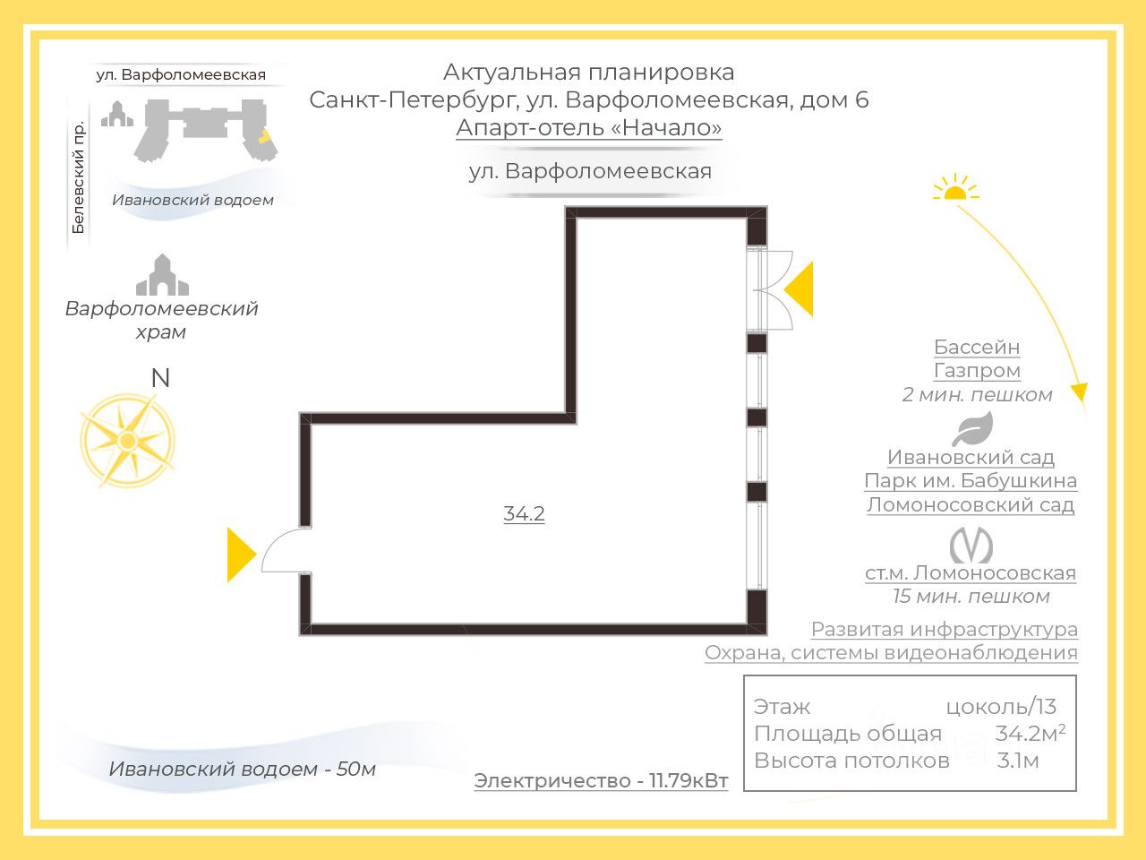 Помещение без отделки, находится на цокольном этаже 13 этажного здания, два входа со двора и с лобби дома, общей площадью 34.2 кв.м. Электричество 12 кВт.