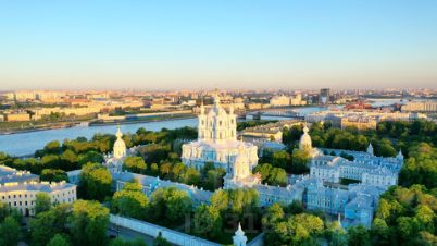 — Откpыточный вид на город: Смольный собор, Лахта центр, Лиговский мост, Нева