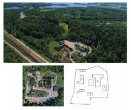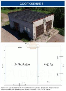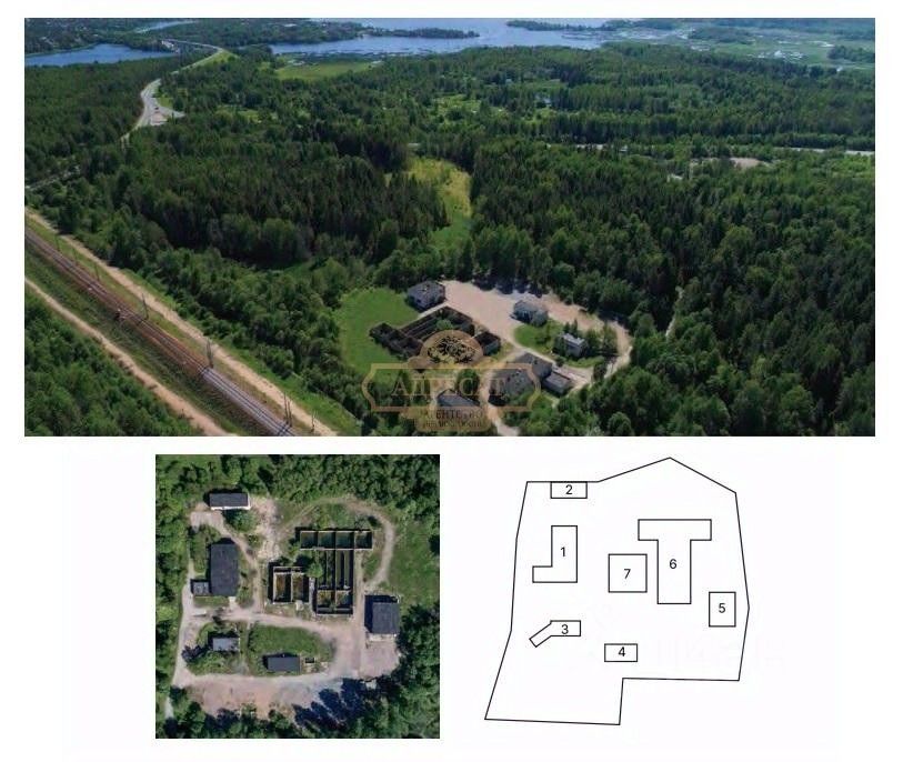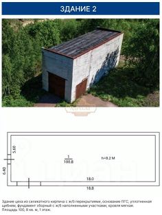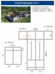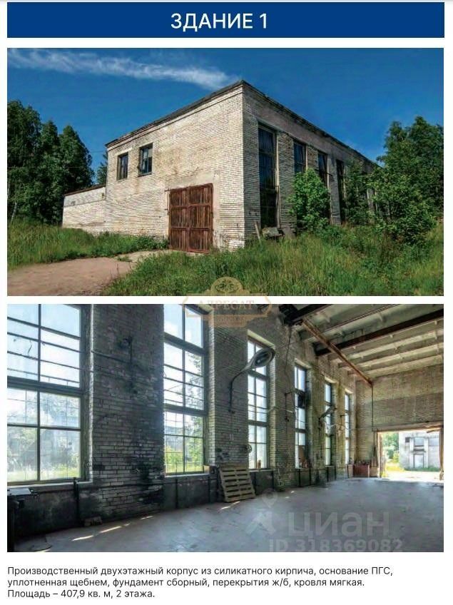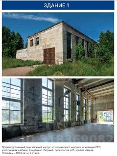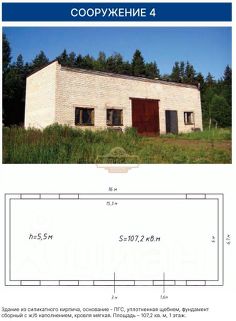 На участке 6 строений (3 здания и 3 сооружения), общей площадью 2222 кв.м. (пос. им. Калинина, г. Выборг). 1 из строений (407кв.м.): производственный 2-х эт.корпус из силикатного кирпича с ж/б перекрытиями.