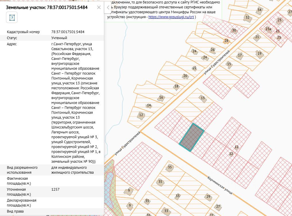 Электронный аукцион по продаже земельного участка для индивидуального жилищного строительства по адресу: Российская Федерация, Санкт-Петербург, внутригородское муниципальное образование Санкт Петербург поселок Понтонный, Корчминская улица, участок 13, площадь 1257 кв.м, кадастровый номер 78:37:0017501:5484