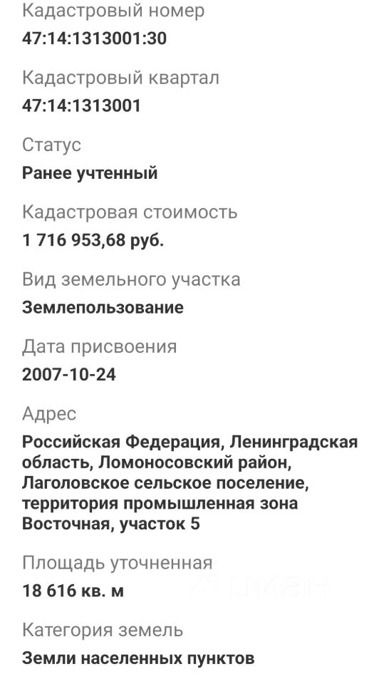 Все участок находятся в собственности у частного лица. Предложение от собственника. Возможен торг и объективное изменение цены. Общая площадь 18 616 кв. м. Кадастровый номер 47:14:1313001:30. Состояние участка: Участок чистый.