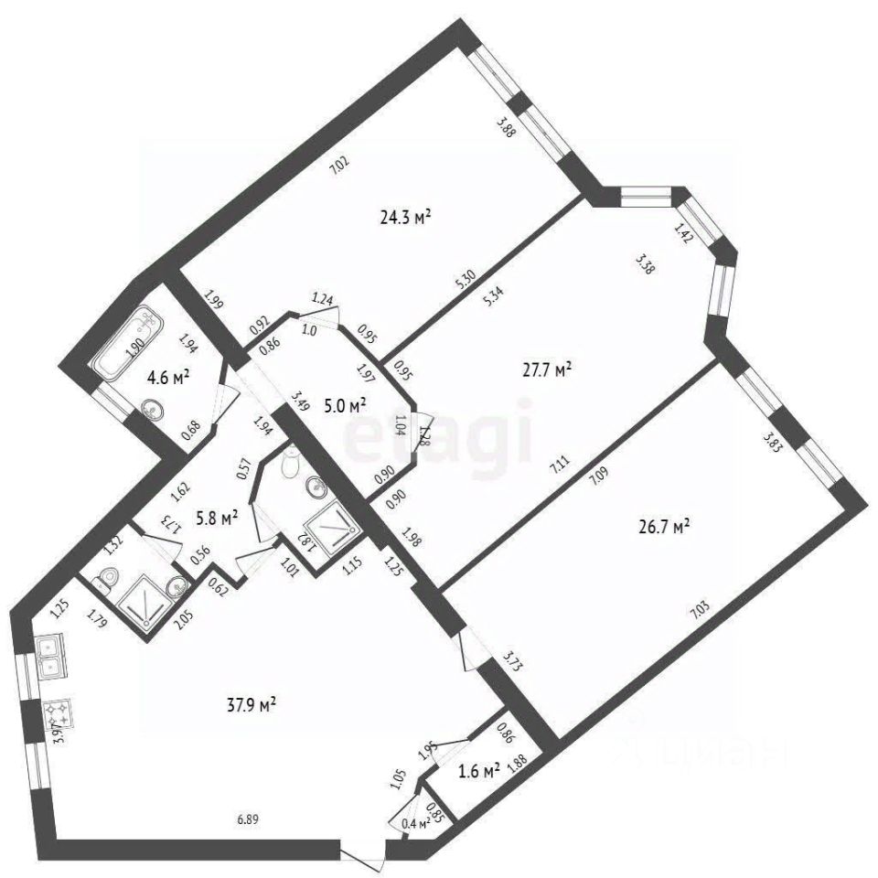 4 санузла: 1 туалет + 3 совмещённых (туалет + душ), включая женский
