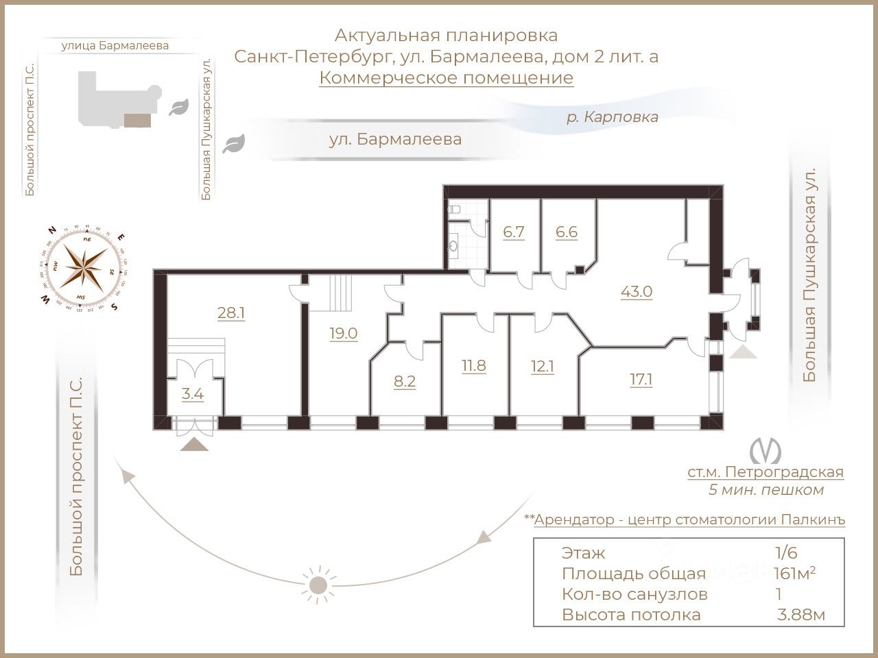В настоящее время помещение сдается в аренду успешному стоматологическому центру "Палкинъ". Стабильный арендатор обеспечивает постоянный доход от инвестиций.