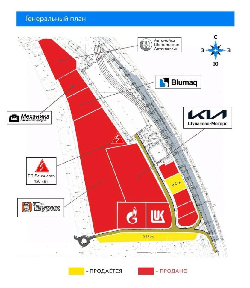 Продается уникальный земельный участок площадью 1,7 га, расположенный на первой линии КАД в составе действующего торгово-индустриального парка KAD GATE PARK, вблизи развязки с проспектом Энгельса. На участке уже построен съезд с КАД, оформленный как часть дорожной инфраструктуры. Съезд передается в собственность вместе с участком это редкий и стратегически важный актив, обеспечивающий прямой доступ с КАД к вашей будущей площадке. Адрес и окружение: Ленинградская обл., Всеволожский р-н, у пересечения пр. Энгельса и КАД, напротив МЕГА Парнас (внутреннее кольцо 25 км КАД). В окружении: ТЦ МЕГА, Лукойл, Газпром, CHERY, Петрович, TOYOTA, Озон, Яндекс Маркет, "Северная долина", склады, автосервисы и оптовые центры. Правовой статус: частная собственность Категория земель: земли населённых пунктов Назначение по Генплану: общественно-деловая и промышленная зона Назначение по ПЗЗ: деловое, торговое, производственное и административное Инженерная инфраструктура: вдоль участка сети Петербург-Газ, Водоканал, Ленэнерго