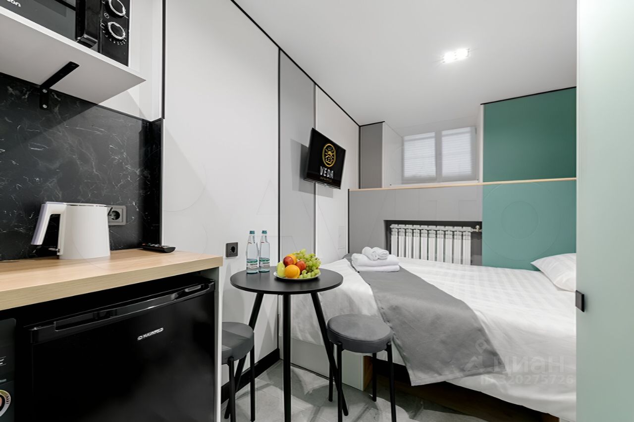 Номер полностью укомплектован для проживания: мебель, бытовая техника, кухонная зона, посуда и т. Д. Апартаменты представлены в 2-х видах интерьера.
