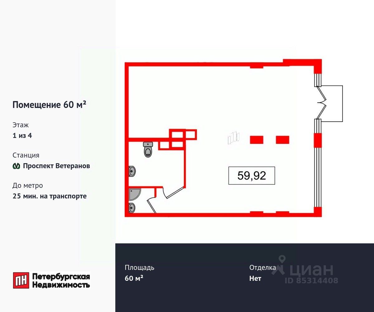 Продается помещение в ЖК Дворцовый фасад коммерческое площадью 60 м2. Помещение расположено рядом с метро Проспект Ветеранов. Расстояние до метро 25 Мин.на транспорте. Корпус сдан. Без отделки.
