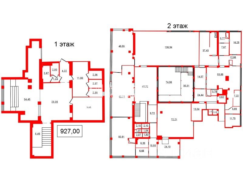 Площадь первого этажа- 850 кв.м, второй этаж - 850 кв.м, остальное - подвал, и свободные помещения, которое используется под склад.