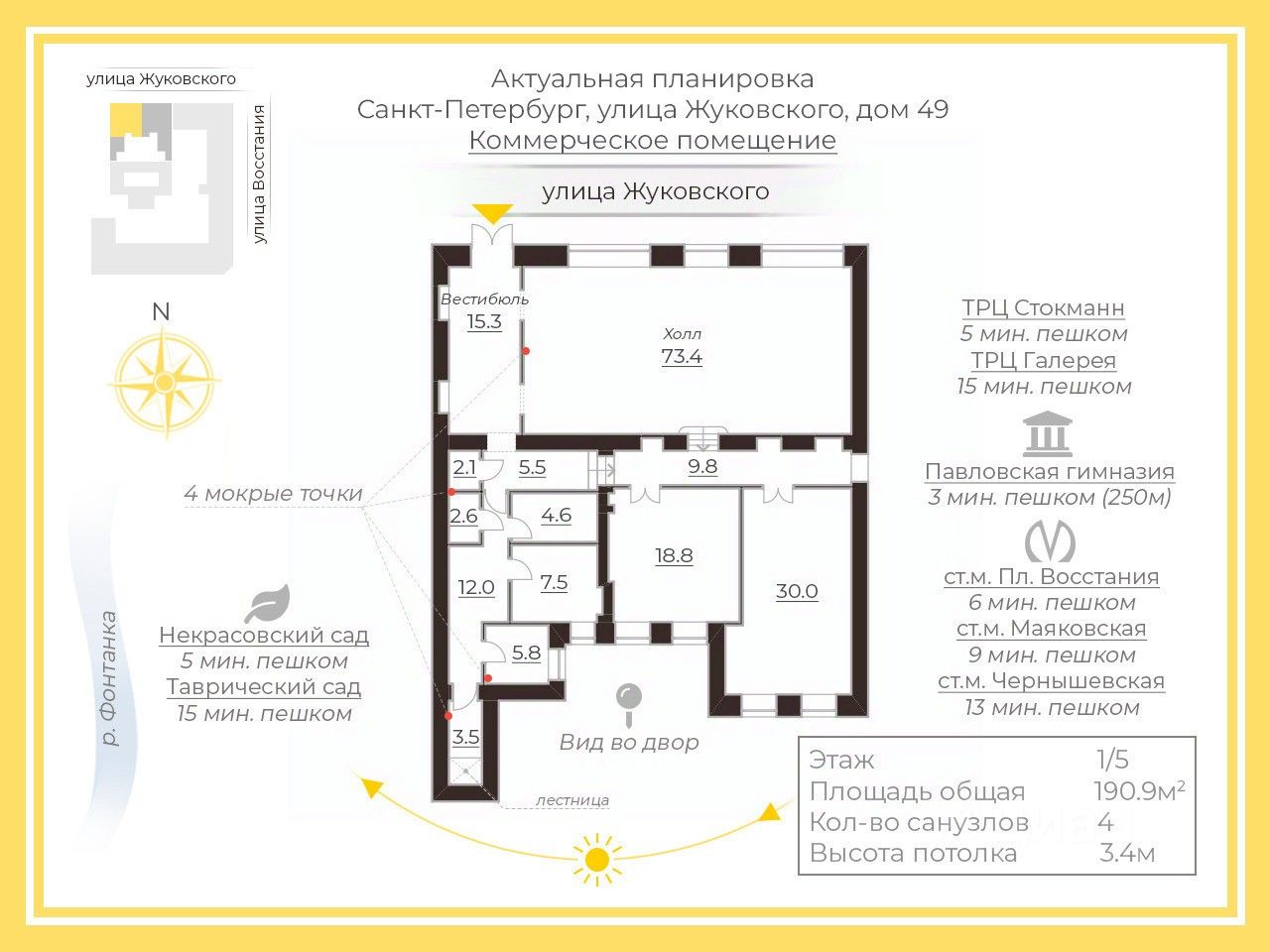 На исторической улице Петербурга - улице Жуковского, которая обладает большой силой притяжения жителей города и туристов, благодаря окружающим ее соседям ул. Восстания (через 1 дом), ул. Некрасова, ул. Маяковского, а так же Лиговский и Литейный проспекты, в доме номер 49 (рядом с перекрестком ул. Восстания/ул. Жуковского) расположился интереснейший коммерческий объект.