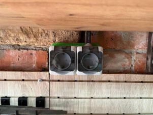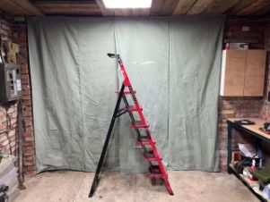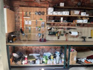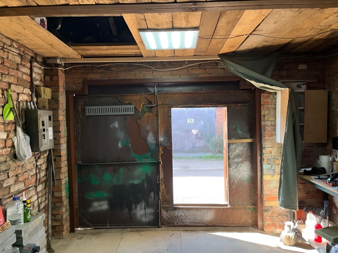 Рабочая зона, система хранения колес, есть погреб, ворота зондированы шторами, пять точек электропитания+ 380 В.