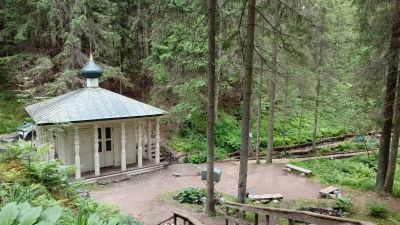 На территории освящённый родник и часовня.
