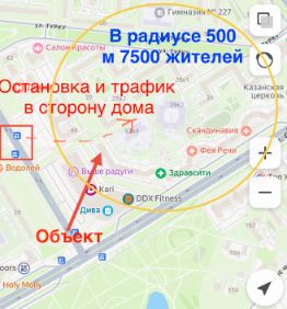 Помещение расположено в густонаселенном районе, в радиусе 500 метров около 3000 квартир=7500 жителей.