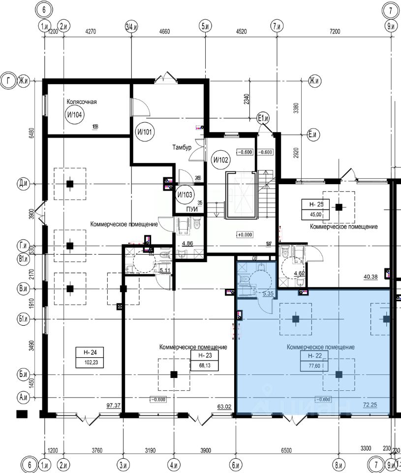 Помещение свободного назначения класса "бизнес" 77.6 м² в ЖК "iD Kudrovo II" с выдержанными фасадами и превосходным витражным остеклением и современной инженерией. Каждому коммерческому помещению выделена зона для стилизованной вывески. Каждое помещение оборудовано индивидуальным вентиляционным каналом. Высота потолков 4,5 метра. Выделенная мощность 0,2 КВт на 1 метр квадратный.