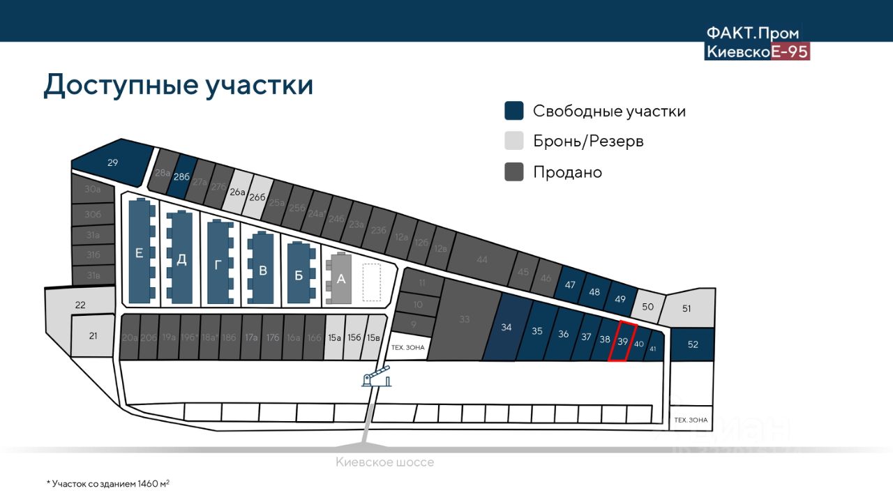 Участок 38,16 соток (уч. 39), находится на территории индустриального парка Киевское-95 класса А, на 1 линии Киевского шоссе со своим съездом, автоматизированным КПП, охраной и видеонаблюдением, асфальтовыми проездами с тротуарами и освещением, автобусные остановки, от метро Московская 20 мин, КАД - 10 мин.
